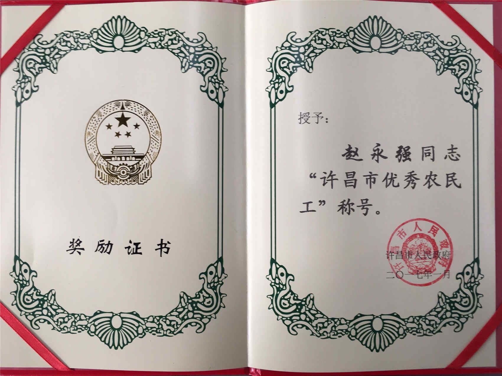 我公司員工趙永強(qiáng)同志喜獲“許昌市優(yōu)秀農(nóng)民工”稱號